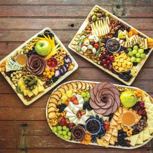 “The popularity of sizes has changed since 2020 from heart-shaped trays for two people to the 5-person size last year. This year it’s more like 10 or 15-person trays,” she says. “People also like the individual servings, the charcuterie cups with skewers, or the mini-snack boxes.”