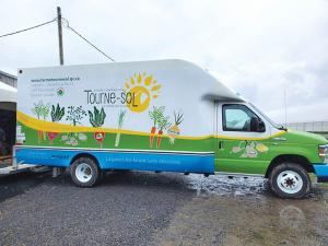 Tourne-Sol’s truck is an E450 DRW with a 16-ft. Unicell body. Allaway added airbags to the rear axle and a hydraulic liftgate and is hoping to also add a motorized awning to provide shade for a market-style sales setup. They use the truck primarily for local distribution of the farm’s CSA basket program. The 85kWh battery pack provides a range of about 100 to 150 miles. They can use Quebec’s rapidly expanding network of fast chargers (50+kW) on the road if they need to go further. The cost per km for charging is 4 to 15 cents for electricity (charge-at-home vs. fast charging), which compares favorably with the 50 cents per kilometer for the truck’s original V8 gas engine.