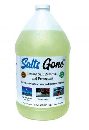 “Salts Gone removes salt and brine residues and leaves a protective barrier to prevent new salt from attacking the surface. It works by bonding itself to the sodium and chlorine in salt, which breaks their bond.