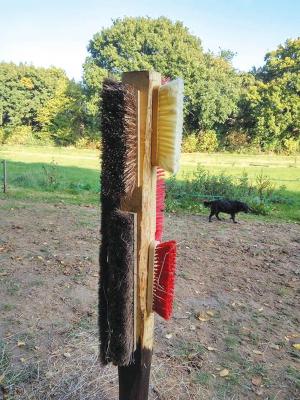 One broom head can work, although multiple make the scratcher more accessible for multiple animals at once. They tend to be cheap at yard sales. Think through the height—too low, and the animal won’t reach it. Some prefer to mount them to freestanding 4 by 4 posts or trees.