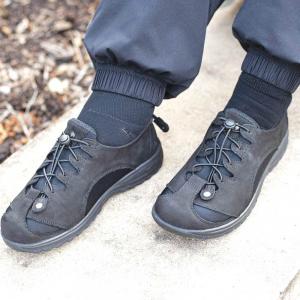 Pandere uses a variety of materials and construction techniques to allow its shoes to adjust in width and volume. The patented design expands in the heel, mid-foot, and toe box. The broad base and removable insoles accommodate orthotics. They have an anti-slip, recycled rubber bottom.