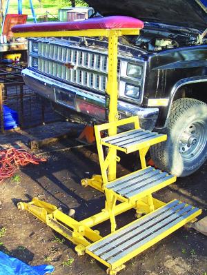 Robert Greenwood of Bellwood, Neb., has engineered a solution to inaccessible vehicles. “Pickups are so tall now that I can’t service them from the ground,” he explains. “So, I took two bad floor jacks, some steel, a fiberglass step tread, and a folding tall creeper that allows me to adjust the height for any of the trucks and walk right up to work or get to a dipstick.”