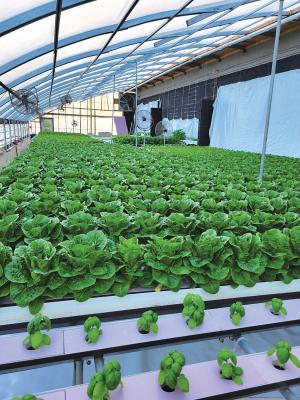 “Cucumbers grow overhead and are highly productive. With 30 plants, we harvest 800 lbs./week,” Thoele says. Romaine lettuce is picked as a living plant by leaving the roots wrapped around the base to increase shelf life.