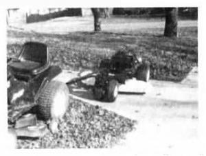Offset Pull-Behind Mower HAY & FORAGE HARVESTING Mowers (38) 19-4-36 I'm sending along a photo of an offset pull-behind mower I built last summer. I started with an IHC 44-in. deck, the rear wheels and tires off an old Sears electric tractor, and a new 12-hp. Briggs & Stratton engine. We fabricated the frame from 1 by 2-in. steel tubing and made the caster assembly for the front wheels. The offset tongue is adjustable for different width tractor mowers. (John Payne, 522 E. Fourth Ter., Lees Summit_ Mn_ 64063)