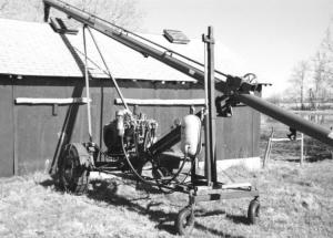 He mounted a 20 hp 4-cyl. gas engine on a steel frame equipped with big 10.00 by 20 drive wheels on front and 4 by 8 caster wheels on back. The engine belt-drives a hydraulic pump that powers a pair of orbit motors, one for each drive wheel. A vertical hydraulic cylinder attached to a jack is used to raise or lower the auger.
