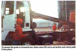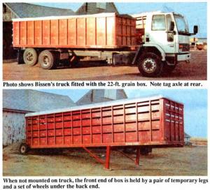Bissen says he got the idea from scrap trucks that pick up dumpsters loaded with construction debris or other garbage. "It lets one truck de the work of two with just one subframe and hoist. With either box mounted, the truck is as good or better than any grain or livestock hauler on the market," says Bissen.