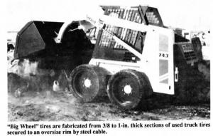 "Big Wheel" tires are fabricated from 3/ 8 to 1-in. thick sections of used truck tires secured to a heavy-duty oversize rim by steel cable. Each flap of tire is 12 in. by 5 in. According to Prevost, over 2 in. of rubber can be worn off before the tire needs to be replaced compared to 1/2 to 3/4 in. on a conventional tire.
