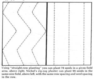 "You can plant 25% more seed with this zig-zag pattern than with a conventional drill," says William Nichols, of Corral, Idaho, inventor of the "Zig-Zag" drill. Its hydraulically-driven planting shoes move back and forth to get more seed planted per acre, and to get it spaced more uniformly.