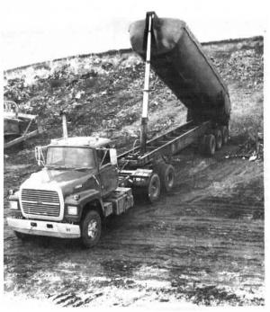 The triple axle trailer frame is made out of 3/4-in. steel plate. The back end of the tank hinges on a 3-in. dia. shaft. A 4-section telescoping hoist raises the front of the box about 20 ft. to dump. One of the biggest advantages of the idea is that there are no corners so loads dump out completely.