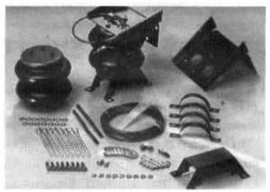 Rear end sag on pickups can be cured by installing our new "air bag" load-leveler and stabilizer. "Air Helper' air bags bolt onto each side of the pickup between the frame and rear axle. They're equipped with air line inflation valves so they can be filled up just like you fill up a tire with air. The air bags keep the pickup's leaf springs from sagging under heavy loads to eliminate rear end sag and maximize the load carrying capacity of the pickup.