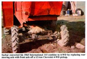 Sachar paid $100 for the front axle off a 1972 Chevrolet 4-WD pickup. The axle was equipped with lockout hubs. He turned the axle upside down and fitted it with an oscillating mount (taken from an International 105 combine) that allows the axle to pivot back and forth. He welded a 3/4-in. steel plate, fitted with a bearing and a hydraulic motor, onto the combine frame ahead of the axle and ran a 12 in. long, 1-in. dia. shaft from there to the axle's original driveshaft. The hydraulic motor chain-drives the drive-shaft and is powered by a hydraulic pump that's chain-driven off the engine crank-shaft.
