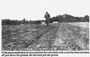 Wells is proof that one person's weed can be another's livelihood. His company, W. S. Wells & Son, was founded in 1896 by his grandfather. Wells and his son Adrian, Jr., represent the third and fourth generations. "As far as we know we're the only company in the world that cans dandelion greens," says Wells, noting that the company also cans fiddleheads, a gourmet vegetable` that grows wild, and beet greens. From 1911 to 1929, the cannery discontinued dandelions because of a diminishing wild supply in nearby regions.