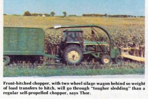 "We've converted pull type choppers of various makes and models for front hitching, but the Deere 3800, with a two or three-row head (30 or 38 in. rows) is by far the most practical and popular," says Thor. "It'll go on most any make of tractor, whether two or four wheel drive."