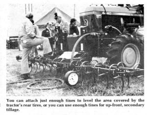 It levels the ground in front of the tractor tires for a smooth ride. You can attach just enough tines to level the area covered by the tractor's rear tires, or you can put tines all the way across to both level and till. With this up-front secondary tillage, you can field cultivate, incorporate chemicals and plant behind your tractor in a once-over operation.