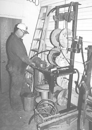 The Elliotts built a hydraulic hose center where they make their own hose. They built a 7 1/2-ft. tall by 2-ft. wide stand out of 2-in. box tubing. It's fitted with four wood reels holding four different types of hose. A home-made cut-off machine mounts on the left side of the stand. It's powered by a 1/3 hp electric motor and uses a worn out blade off their Makita chop saw as a cutter. A Weather Head collar crimp they bought at a sale for $140 quicktaches to the right side of the stand. It handles collars up to 3/4-in. in dia. and is portable so they can take it to the field.