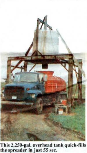 Orr built his own 2,250-gal. overhead fill tank which is designed to fill his spreader from a 20-in. wide valve. "It takes only 55 sec. to fill the spreader. I simply reach out the truck cab window and pull a lever on a hydraulic pump to open the valve," notes Orr. He mounts the tank on the truck with an overhead chain hoist and a skid steer loader. "Two front-end loaders could also be used to lift the tank onto the truck," he notes.