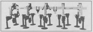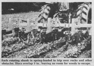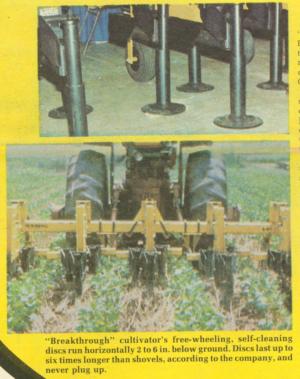 Each row on the cultivator has three discs mounted by heavy linkage to a conventional 5-in. toolbar. The discs' round shanks are spring-loaded to trip over rocks and other obstacles, and they adjust laterally and vertically to varying field conditions. Discs operate at depths of up to 6 in., controlled by a guidewheel on each row. A cultivator set up for 30-in. rows has three 9-in. dia. discs, while a 42-in. row-spaced cultivator has three 13-in. discs. Discs are designed to overlap 3 in. so that as much as 1 1/2 in. can wear off before a gap develops and they need to be replaced.
