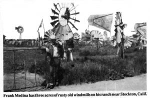 The 84-year-old retired rancher has three acres of rusty old Aeromotor windmills on his small ranch along state route 88. Medina calls his ranch "The Wonderful World of Windmills". He repairs, repaints, and sells the vintage rigs to people across the U.S. and Canada as well as from other countries. The "King of Windmills" became so famous that he was even flown to New York to appear on a national television show.