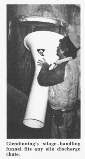 Ken Glendinning, of Lucan, Ontario, got "fed up" with the mess of handling silage out of his silo discharge chute. He developed a fiberglass discharge funnel that not only solved his problem but has solved a similar problem for more than 300 farmers within a 50 mile radius of his farm who have purchased the device since he began selling it several months ago.