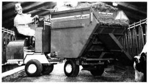 The VestFarm feeder is equipped with a 5-ft. long, 4-ft. wide, and 4 1/2-ft. high feed box. The rear wall of the box moves for-ward, pushed by two hydraulic cylinders toward an unloading chain tilted upward at the front end of the box. The unloading chain unrolls the bale and discharges it onto