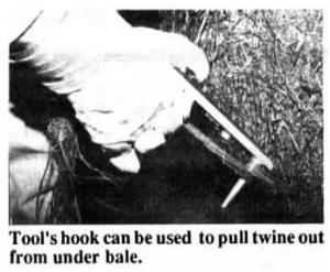 The new tool combines a retractable blade with a hook that's used to clear away snow and ice and to dig out buried twines. Once you cut the twine, you can wrap the loose end around the hook and use it to pull the twine out from under the bale. Handle is big enough you can grab onto it with two hands.