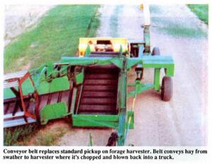 A conveyor belt that replaces the standard pickup on the forage harvester conveys hay from the swather to the harvester where it's chopped and blown back into a truck.