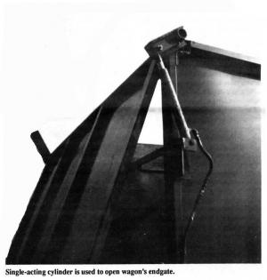As hydraulic pressure is applied, the cylinder under the wagon floor unlatches the end gate. Then the hoist cylinder starts to push the wagon up. Finally the cylinder near the top of the endgate starts pushing the gate back and holds it in the open position. To shut the gate, Olson puts the hydraulic lever in the "float" position. As the wagon starts to drop down, the endgate begins to close as it's pulled back by the remaining lift-assist spring. A pair of lift-assist springs he mounted under the wagon floor then latch the gate shut.