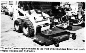 The "Gras-Kat" mower quick-attaches to front of the skid steer loader with two pins and quick couples to the skid steer's auxiliary hydraulics. Cutting blades are driven by a high-speed hydraulic motor mounted on the deck, which floats with loader's flotation system. A pair of caster wheels mount in front of the deck and hard rubber rollers mount at the rear to prevent gouging. "You can go up to 8 mph and because skid steer loaders are so maneuverable it works great for mowing between trees inside windbreaks and orchards," says Don Sligor, president.