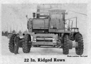 Their Deere combine is also modified for 22-in. row spacing. It has duals with each tire in the dual set spaced 44-in. apart center to center. The final drive is in the middle between the duals. The 12-row header was custom built. Since ridges make it necessary to make it to the end of the field before dumping the combine hopper, they added sides to the hopper so it now holds 320 bu. and also added a 3-ft. long, hydraulically-powered, vertical auger to fill the hopper to capacity.