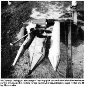 McCoy says the biggest advantage of the chop-pick system is that it lets him feed more corn to cows using his existing forage wagons, blower, unloader, auger feeder and 16 by 55 stave silo. The head cost just $300 to build.