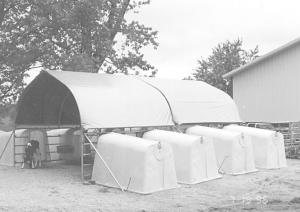 The "Cover-All" is a 12-ft. wide, 11-ft. long, 9-ft. 4-in. high open-ended structure designed to be used between two rows of hutches. Each unit serves four hutches. You line two hutches up on each side and place them against openings along the side. The polyethylene roof has a silver color to reflect sunlight. Tethered calves can get exercise under the cover but are kept separate by divider panels that attach to the sides. The panels reduce the transmission of disease and can be quickly removed for cleaning out manure.