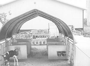 "It's designed to be used as a permanent structure although you can move it if you want. Eight steel stakes are used to anchor it to the ground. Multiple units can be placed end to end and tied together so that you can expand as needed. Any type of hutch can be used including wooden ones. The roof has a 9-in. overhang over the hutches to keep calves completely dry.