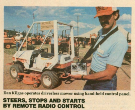 Instead of sitting on the machine when mowing dangerously steep slopes or ditch banks, for example, you simply get off and, using a hand-held control panel, operate the "driverless" mower by remote control. Or, for the ultimate in mowing convenience, you can sit in the shade and mow your entire lawn. Twenty of the first units to roll off the assembly line at Kubota's factory in Japan have been shipped to distributors throughout the United States.