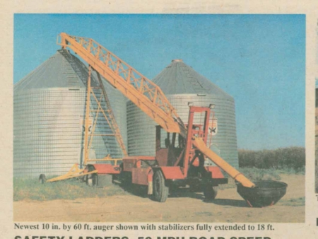 He built the other two models this year. One is equipped with an 8 in. dia. tube 50 ft. long. It's built on an International, K-5 frame and is powered by a Chevrolet 283 engine. The other sports a 10 in. dia. auger 60 ft. long, same as the first auger Wolery built. However, unlike the older 60 footer, it can be fitted with a drag auger for cleaning out bins. Its frame and engine were salvaged from a 1953 Ford 2-ton truck.