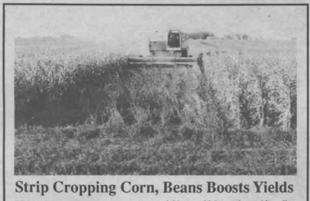 Hagen notes that his stripped-cropped beans, harvested 8 rows at a time, yielded 51.2 bu. per acre. "This is probably about what I would have gotten with conventional planting. With stripping, you do it to boost corn yields without sacrificing bean yields," notes Hagen. "Judging from the size and number of pods, it appeared that the outside bean rows adjacent to corn may have yielded slightly less than the remaining rows because of greater competition for moisture from corn roots and shading."