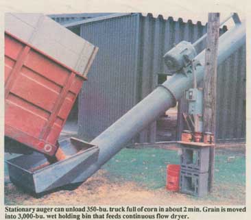 "We wanted an auger that would let a grain truck dump its load and get back to the field before our combine fmished making a round. It's fast, quiet, and reliable and is a pleasure to use," says Fathauer, who farms 1,840 acres. "You can't buy a 17-in. dia. auger ready to go unless you have it custom built by a commercial elevator contractor. My auger cost about about what you would pay for a commercial 10-in. dia. auger, but it can move grain three times as fast.