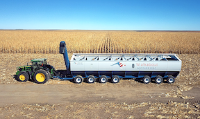 Bern Prewitt Jr., Boyle, Miss.: “We often have problems with elevator lines being terrible and semis having to wait for unloading, so using the 4,000-bu. capacity Walkabout Mother Bin helps keep our three combines rolling in corn, soybeans and rice. We park it in a permanent spot on the edge of a field and our carts dump into it rather than into semis. The 22-in. unloading auger on the bin fills a semi in 3 1/2 mins. from the time the tarp unrolls until it rolls back and the driver heads out. There’s a scale on the bin so we know exactly how much is loaded. We run the bin with a Case 310 Magnum because it takes a good-sized tractor to move it around. The bin helps us get our crops in when conditions are right, so we don’t have downtime with combines waiting in the field.”