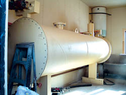 The furnace was built from a giant 13,000-gal. fuel tank measuring 21 ft. long and 13 ft. in dia. The Mollenbecks cut a hole in one end of the tank and inserted a 19-ft. long by 7-ft. dia. rail car tank inside. Then they cut the end off the 7-ft. tank, and used both tanks' end pieces to make a double-walled door to close off the end. The inner tank serves as the firebox and the space between the two tanks is filled with water.