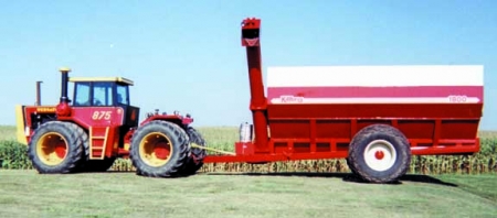 A lot of big, older 4-WD tractors aren't equipped with pto's. Gary Lantz, Augusta, Ill., corrected that situation on his 1979 Versatile 875 4-WD tractor by mounting a Chevy 350 cu. in. gas engine between the tractor's rear wheels. The engine shaft-drives a drop box with a self-contained clutch pack off a 1970's Case 1200 4-WD tractor. A small hydraulic cylinder, driven off tractor hydraulics and connected to a steel arm, engages the clutch pack to turn the pto on or off. Inventions are nothing new for Lantz, who invented the Seed Jet bulk seed handler now sold by Yetter Mfg., Colchester, Ill. Lantz turns a key inside the cab to start the add-on engine and uses the engine throttle to control the pto's speed. A beer keg bolted onto the auger wagon he pulls with the tractor serves as a 15-gal. gas tank for the engine, which is equipped with an electronic fuel pump. "I use the tractor to pull my big 1,000-bu. Killbros auger wagon," says Lantz. "The wagon was too big for my 2-WD tractor and has an 18-in. dia. auger so there was no way I could use a hydraulic motor to operate it. At first I installed a 2-cyl. Deutz diesel engine and used it to operate a 470 bu. auger wagon equipped with a 10-in. dia. auger. However, that engine had barely enough power to operate the pto so when I bought the 1,000-bu. wagon I converted to the Chevy engine. It has about 150 to 170 horsepower. "When Versatile tractors were first sold they could be equipped with an optional pto. However, it really made the tractor complicated because to install it the transmission had to come out so that a shaft could be run through it to the clutch. It was hard to service and actually reduced the tractor's resale value. "The Chevy engine came with a governor and its speed happened to be just right for turning the pto at 1,000 rpm's. I used the Case tractor's drop box because it had its own clutch pack, which allows me to turn the drop box on or off independent of the engine. The cylinder that operates the clutch pack is off a fertilizer spinner spreader." Lantz ran hoses from the tractor's water-cooled diesel engine back to the add-on gas engine in order to keep it cool. "In cold weather I can start the add-on engine first in order to warm up the diesel engine before I start it. It'll warm the tractor engine up to about 160 degrees."