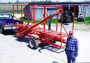 The caddy rides on two 12.16 by 5-in. truck tires. Bags are loaded onto it with a forklift. Power is supplied by a hydraulic system on the 1975 Ford F-250 pickup the Hartwegs use to pull it.