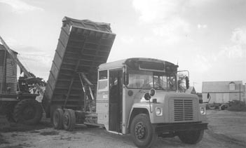 Scripter started with a 1977 International 1700 school bus equipped with a 392 cu. in. engine and automatic transmission. He removed everything except for the front portion of the bus and the frame. He unbolted the rear 10-in. section of the bus body, moved it forward, and rebolted it just be-hind the first row of seats to form a cab. He mounted a 17-ft. truck bed and hoist on the open frame behind the cab. He then mounted a pusher axle -- made from the front axle from another bus -- in front of the rear wheels. The bus's power steering pump is used to operate the dump hoist.