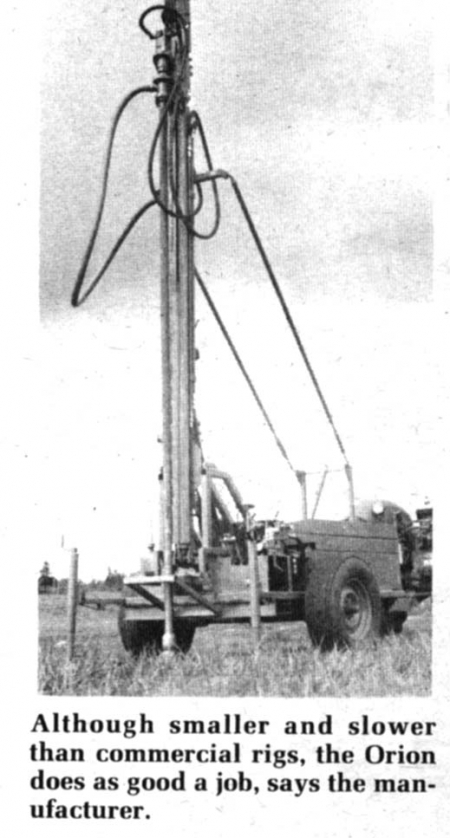 A scaled-down rotary well drilling rig, designed for use by the farmer or rancher himself and priced accordingly, is new from Orion Mfg., Dexter, Ore.
