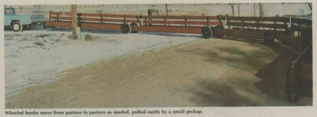 Bunk sections are ganged up in groups of two to five and pulled in one straight line. A line of five feeders is 100 ft. long but Gibbs says he can easily maneuver them in and out of farm buildings and down narrow country roads because each trails directly behind the one in front of it.