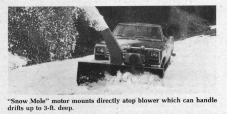 The 88-in. wide Snow Mole is powered by either a 25 hp Onan engine or a specially-designed Volkswagen 1600 cc engine. The 500-lb. rig attaches quickly with just three pins -- once the mounting brackets have been installed. It raises and lowers hydraulically and has an adjustable snow discharge chute. All controls are in cab.